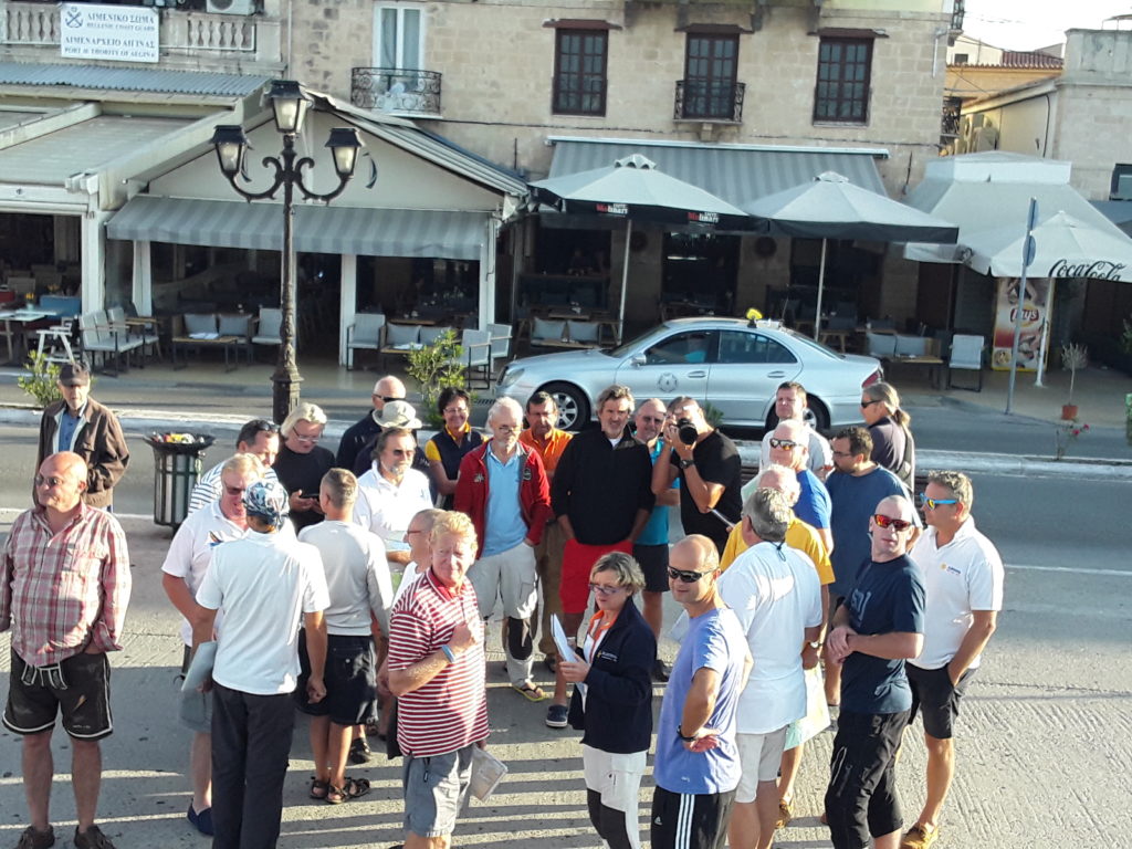 Nachdem die Transferbusse vom Flugplatz bei unserer Partnerfirma „Ionian Charter“ eingetroffen waren, ging es zügig zur Yachtübernahme und den Einkauf. Pünktlich um 19:00 erschienen alle Crews zur offiziellen Eröffnung der Regatta. Wie alle Jahre wurden wir von der Chefin des Stützpunktes und Clubmitglied Elena Vrioni bei einem Grillfest auf das tollste Bewirtet. Dieser erste gemeinsame Abend bietet allen Teilnehmern die Gelegenheit sich wieder einmal zu treffen, für neu dazugekommene Crews auch um sich bekannt zu machen.