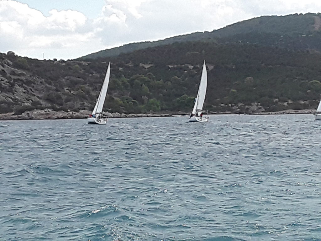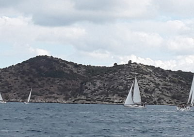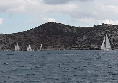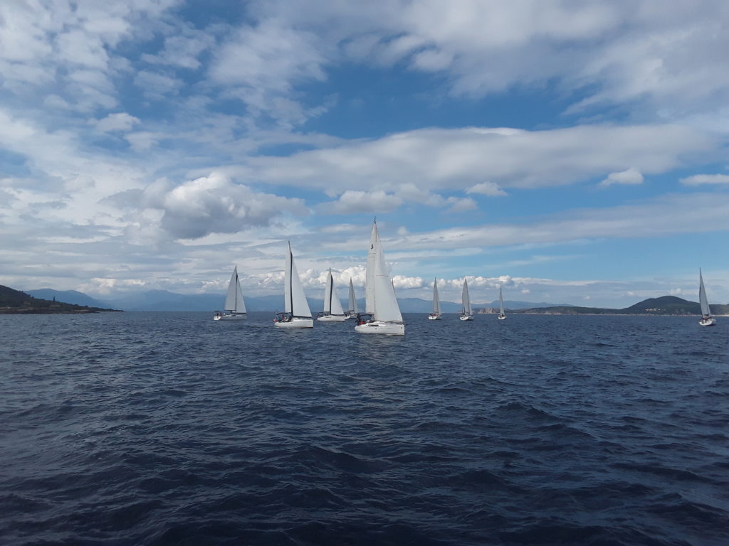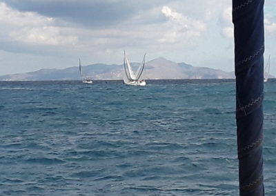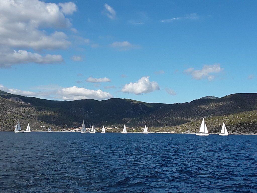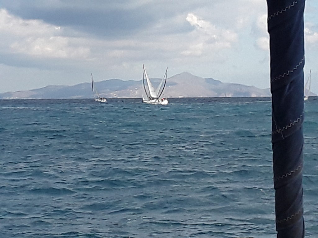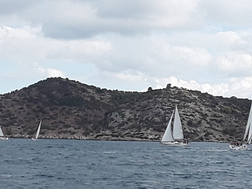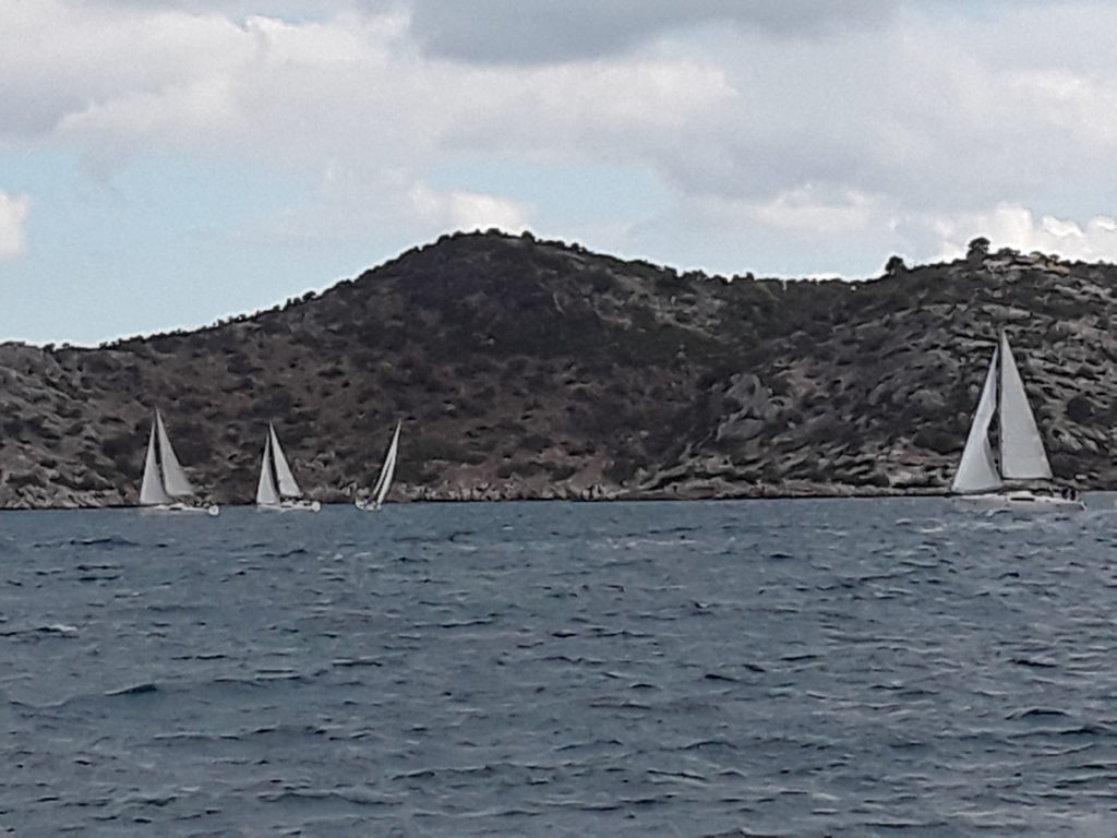 Insel Kira, diese Bb runden, weiter zur Insel Petronisi, diese Bb runden und in die Bucht von Korfos wo ein Ziel aufgebaut ist. Windprognose ab Mittag S – SE 2-3 Bft. abends drehend auf NE. Es wurde mit dem Follow me ins Startgebiet ausgelaufen, pünktlich setzte der SE ein und es wurde mit einer Vorlegeboje die Wettfahrt gestartet. Da der Wind während der Wettfahrt immer schwächer wurde, nahm die Wettfahrtleitung eine Zwischenwertung im Nordosten der Insel Kira, wo alle Yachten durchkamen. Um 16:00 war es soweit, die Wettfahrt wurde aus Windmangel abgebrochen. Doch dank der Zwischenwertung konnte ein Tagesergebnis bekanntgegeben werden. Länge der abgebrochenen Wettfahrt 9,5 Sm.