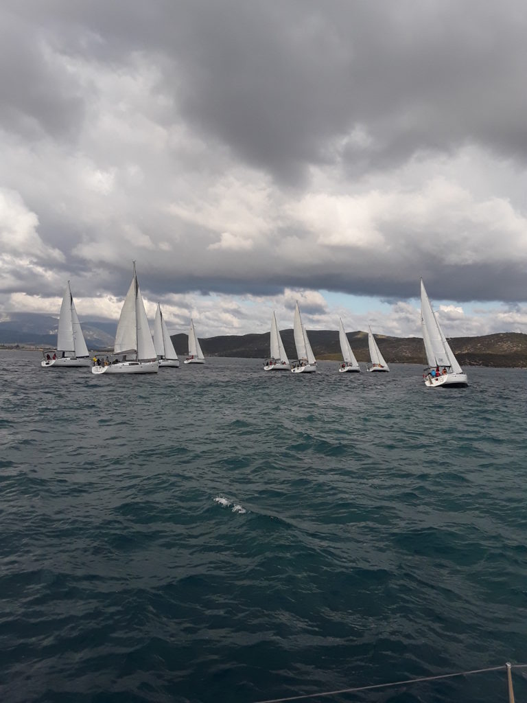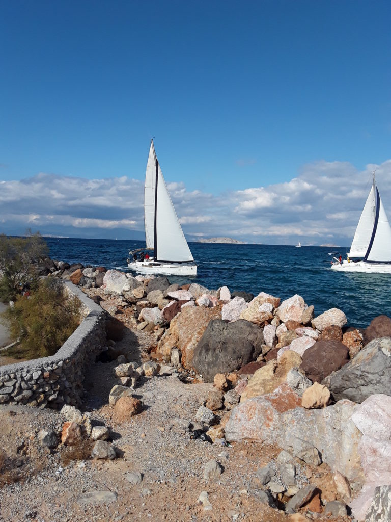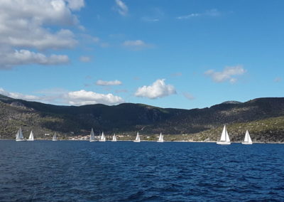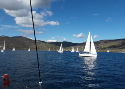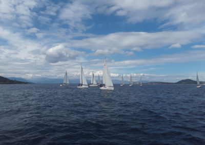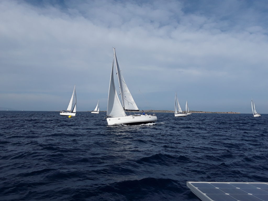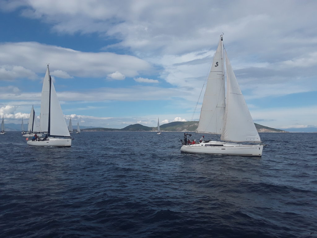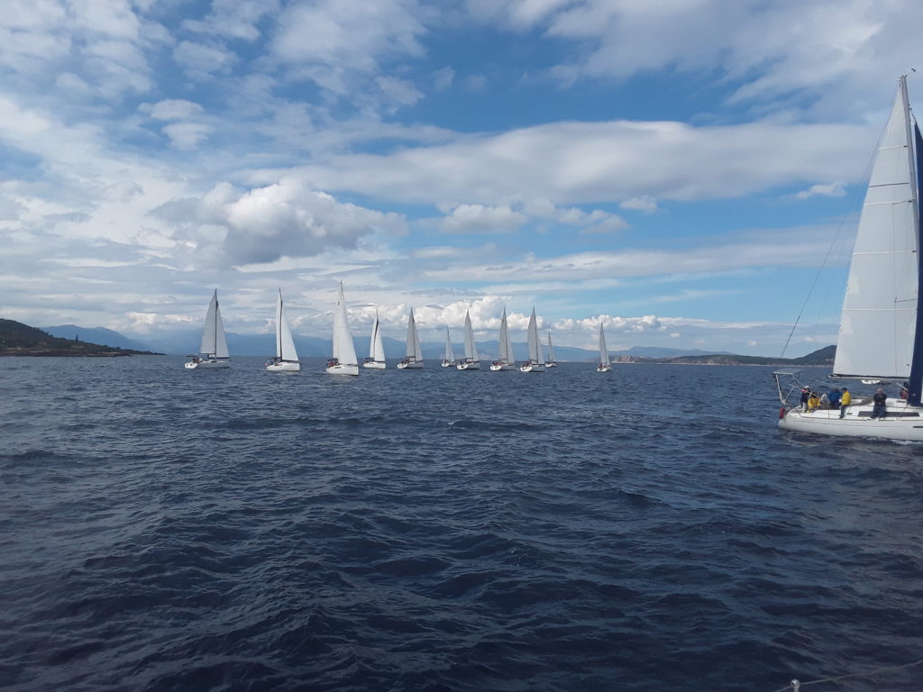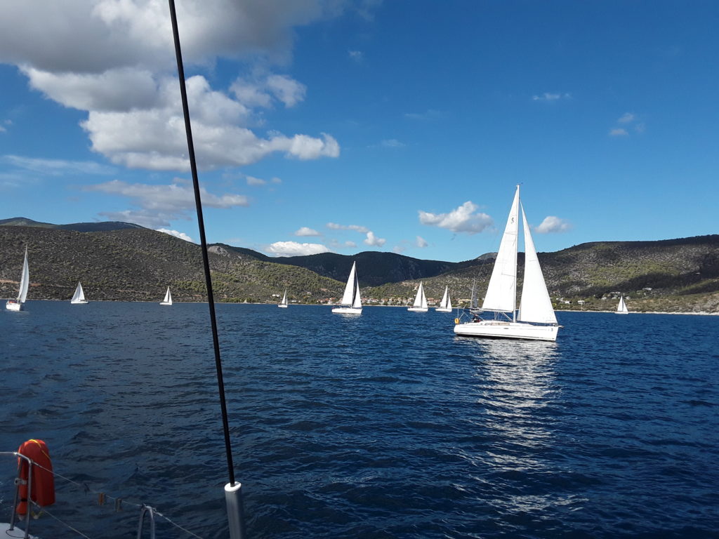 Insel Kira, diese Bb runden, weiter zur Insel Petronisi, diese Bb runden und in die Bucht von Korfos wo ein Ziel aufgebaut ist. Windprognose ab Mittag S – SE 2-3 Bft. abends drehend auf NE. Es wurde mit dem Follow me ins Startgebiet ausgelaufen, pünktlich setzte der SE ein und es wurde mit einer Vorlegeboje die Wettfahrt gestartet. Da der Wind während der Wettfahrt immer schwächer wurde, nahm die Wettfahrtleitung eine Zwischenwertung im Nordosten der Insel Kira, wo alle Yachten durchkamen. Um 16:00 war es soweit, die Wettfahrt wurde aus Windmangel abgebrochen. Doch dank der Zwischenwertung konnte ein Tagesergebnis bekanntgegeben werden. Länge der abgebrochenen Wettfahrt 9,5 Sm.