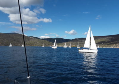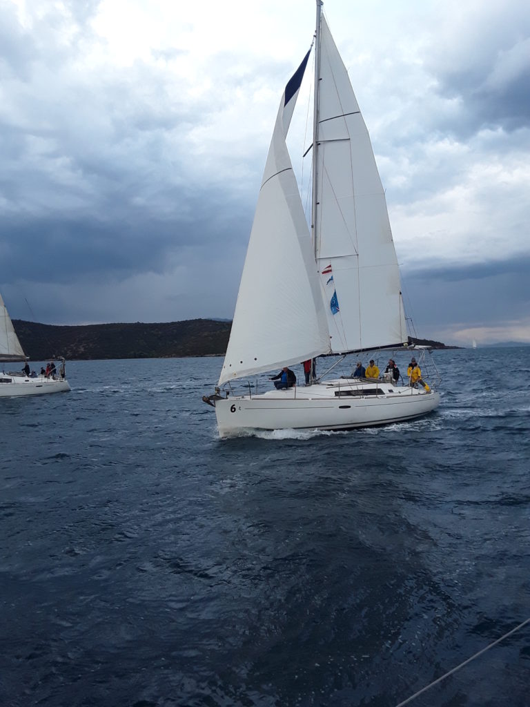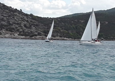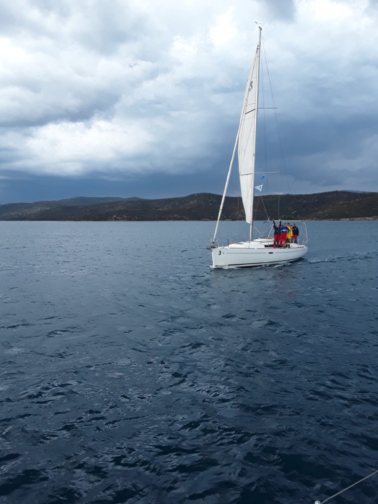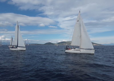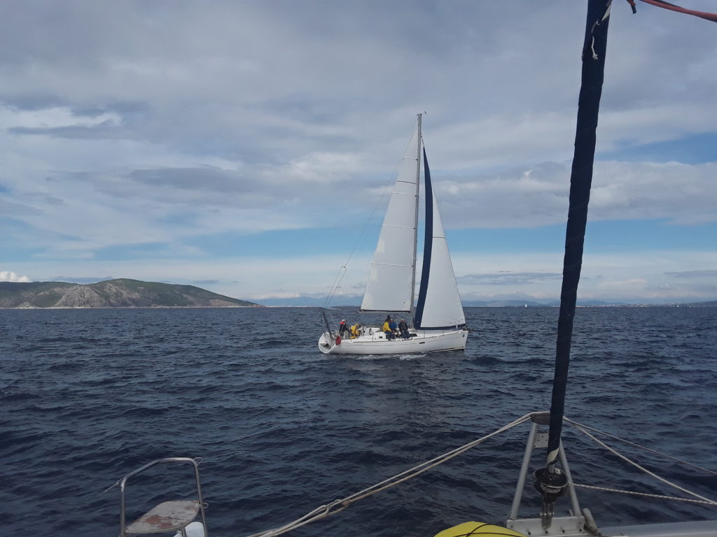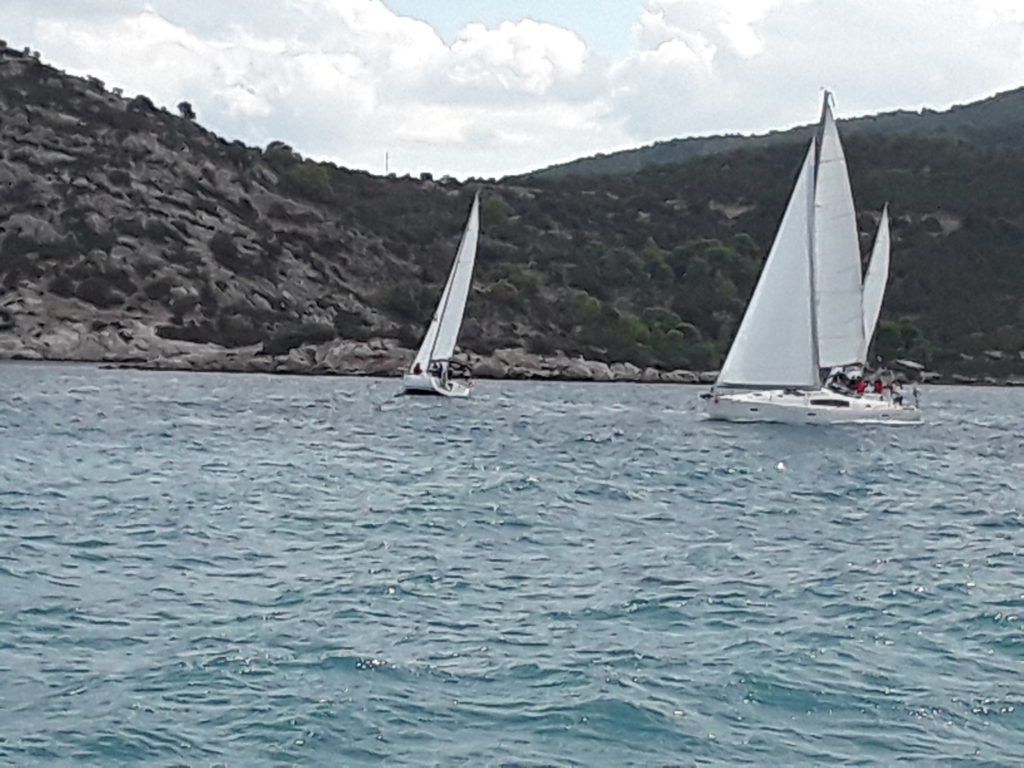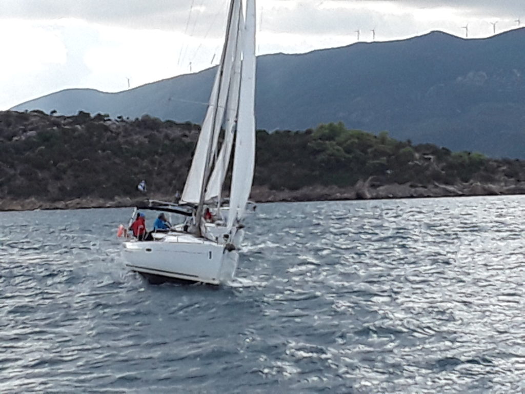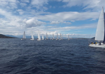 Insel Kira, diese Bb runden, weiter zur Insel Petronisi, diese Bb runden und in die Bucht von Korfos wo ein Ziel aufgebaut ist. Windprognose ab Mittag S – SE 2-3 Bft. abends drehend auf NE. Es wurde mit dem Follow me ins Startgebiet ausgelaufen, pünktlich setzte der SE ein und es wurde mit einer Vorlegeboje die Wettfahrt gestartet. Da der Wind während der Wettfahrt immer schwächer wurde, nahm die Wettfahrtleitung eine Zwischenwertung im Nordosten der Insel Kira, wo alle Yachten durchkamen. Um 16:00 war es soweit, die Wettfahrt wurde aus Windmangel abgebrochen. Doch dank der Zwischenwertung konnte ein Tagesergebnis bekanntgegeben werden. Länge der abgebrochenen Wettfahrt 9,5 Sm.