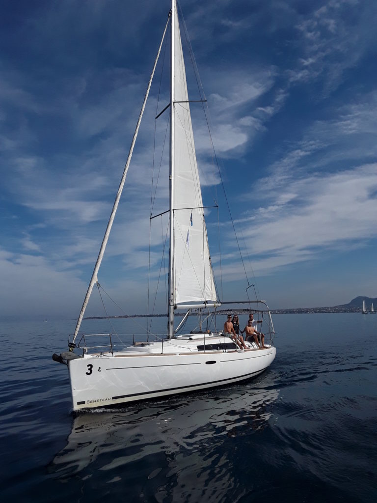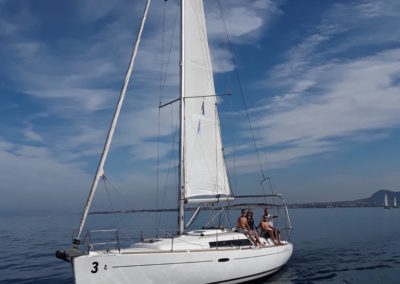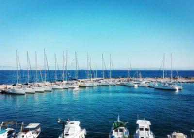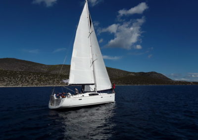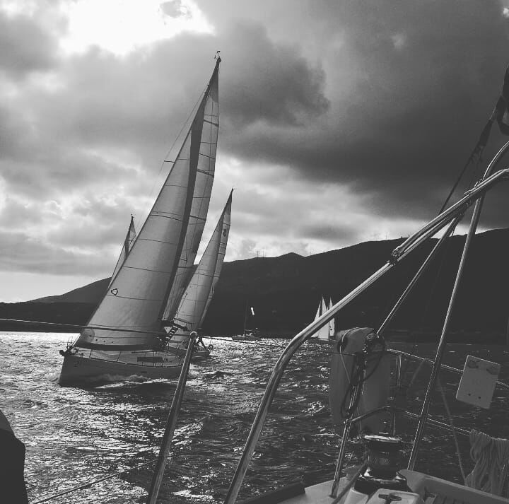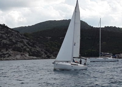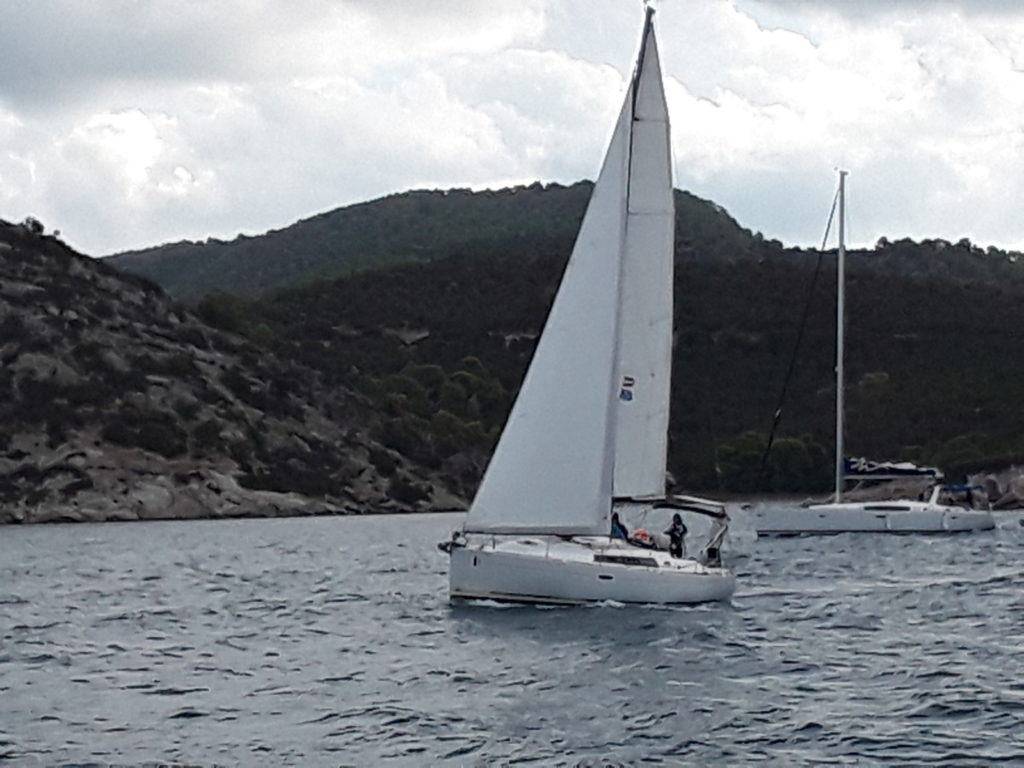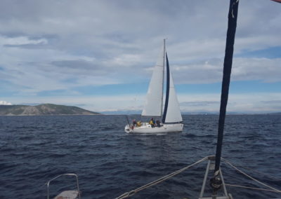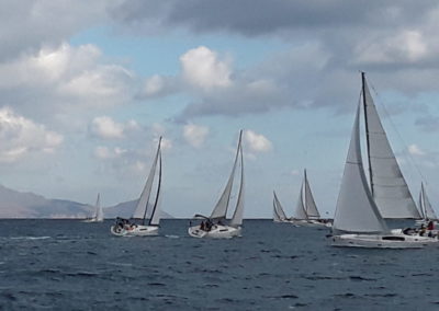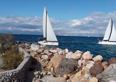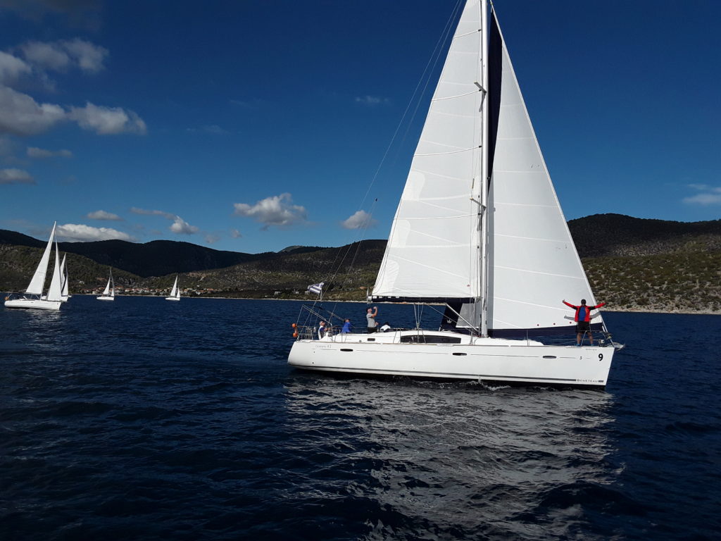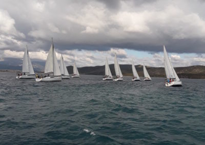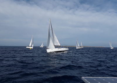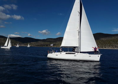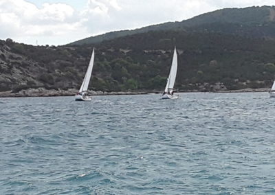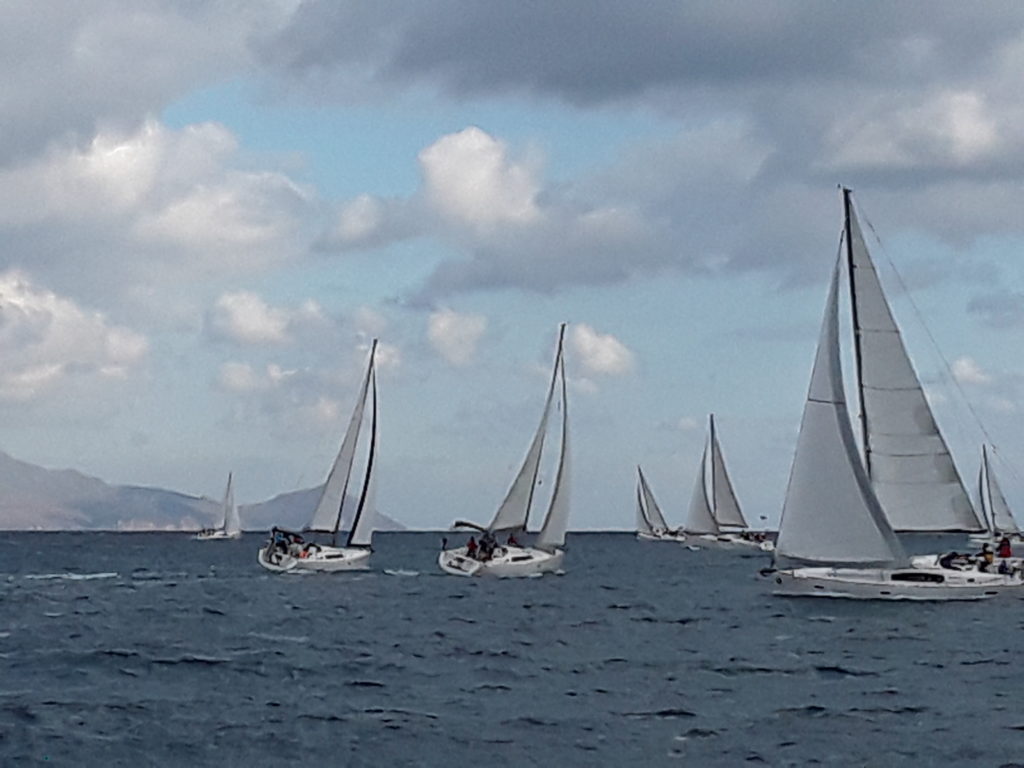 Insel Kira, diese Bb runden, weiter zur Insel Petronisi, diese Bb runden und in die Bucht von Korfos wo ein Ziel aufgebaut ist. Windprognose ab Mittag S – SE 2-3 Bft. abends drehend auf NE. Es wurde mit dem Follow me ins Startgebiet ausgelaufen, pünktlich setzte der SE ein und es wurde mit einer Vorlegeboje die Wettfahrt gestartet. Da der Wind während der Wettfahrt immer schwächer wurde, nahm die Wettfahrtleitung eine Zwischenwertung im Nordosten der Insel Kira, wo alle Yachten durchkamen. Um 16:00 war es soweit, die Wettfahrt wurde aus Windmangel abgebrochen. Doch dank der Zwischenwertung konnte ein Tagesergebnis bekanntgegeben werden. Länge der abgebrochenen Wettfahrt 9,5 Sm.