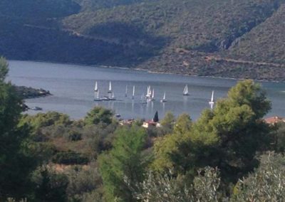 Dienstag 24.10. 09:00 Skipperbesprechung bei „Papa Georgi“ Windprognose 2 -3 Bft. aus West. Tagesziel Vathi auf Methana, Start in der Bucht von Korfos, weiter zur Insel Petronisi, diese Stb. runden, weiter zur Insel Spalathronisi, diese Bb runden, weiter nach Kira, diese Stb. runden, weiter zur Durchfahrt Angistri – Dorousa und zum Ziel vor Vathi. Der für 11:00 angesetzte Start musste verschoben werden, da der prognostizierte W nicht einsetzte. Im Gegenteil um 11:45 konnte mit SE Wind gestartet werden. Dieser hielt aber nicht lange und so wurde eine Bahnverkürzung mit Ziel nach der Insel Spalathonisi vorgenommen. Alle Yachten kamen durch eine 2. Wettfahrt war beendet. Länge der verkürzten Wettfahrt 8.5Sm.
